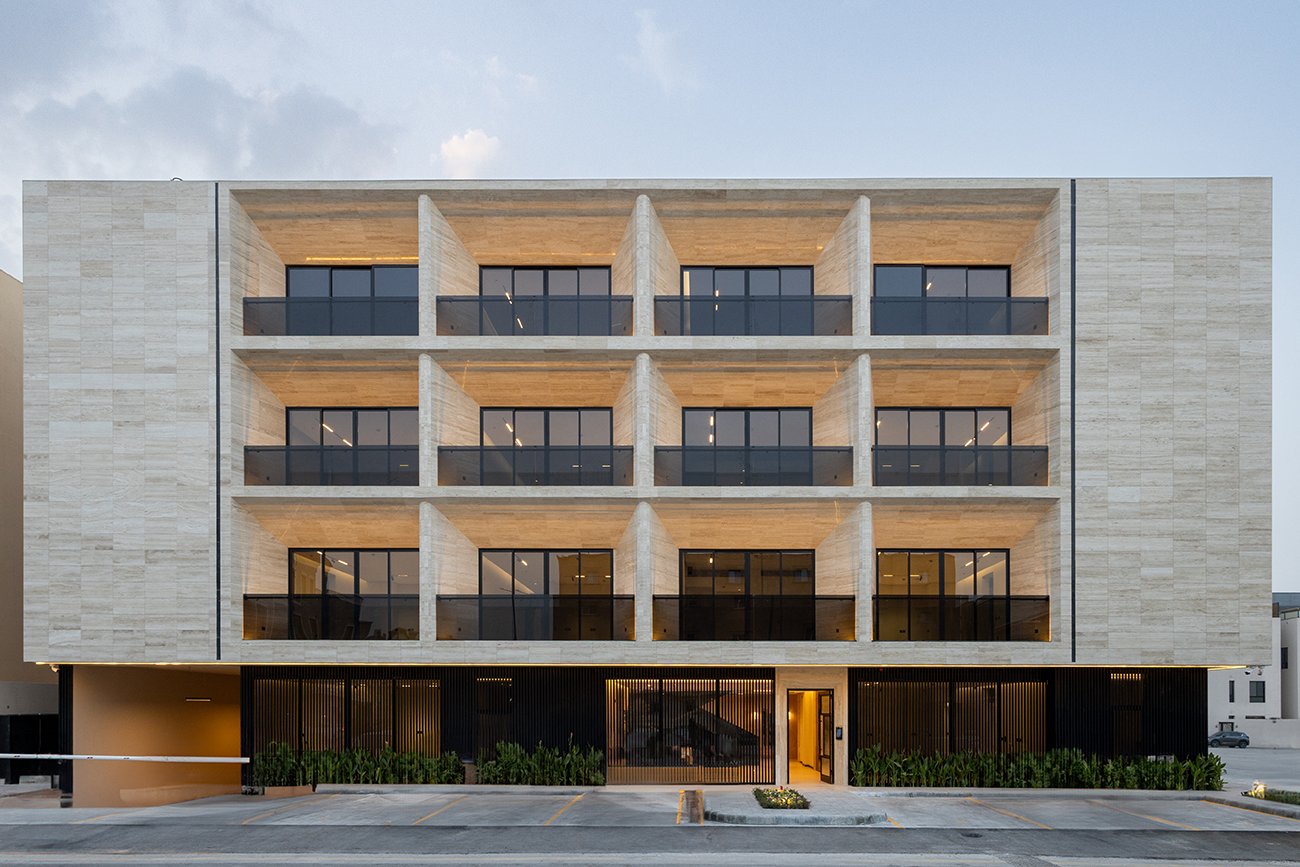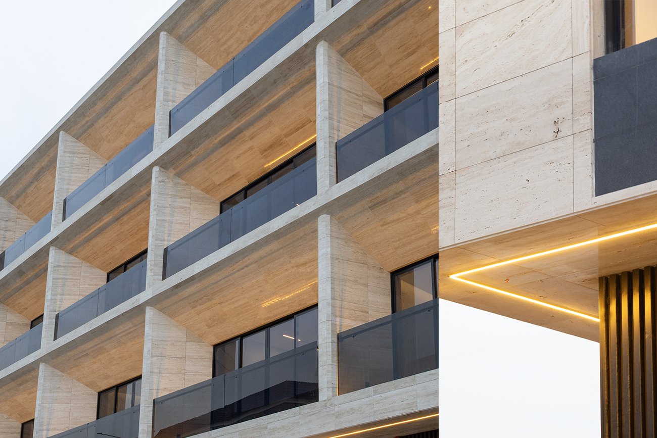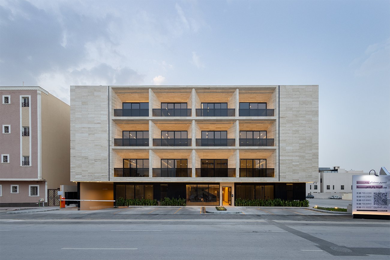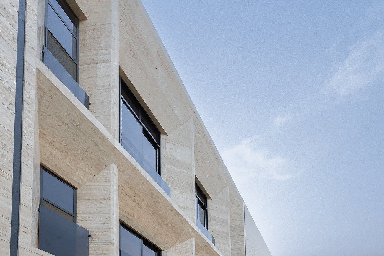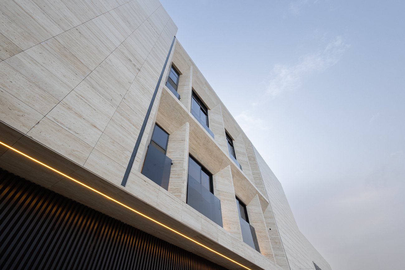 The exterior design of Alasas 4 is defined by its bold and climate-responsive architecture. The solid massing of the building, combined with angled corners in varying degrees, enhances structural sharpness and visual appeal. To complement the geometric architectural form, travertine stone was selected to clad the entire façade, offering both elegance and durability, making it an ideal material for the Arab climate.
