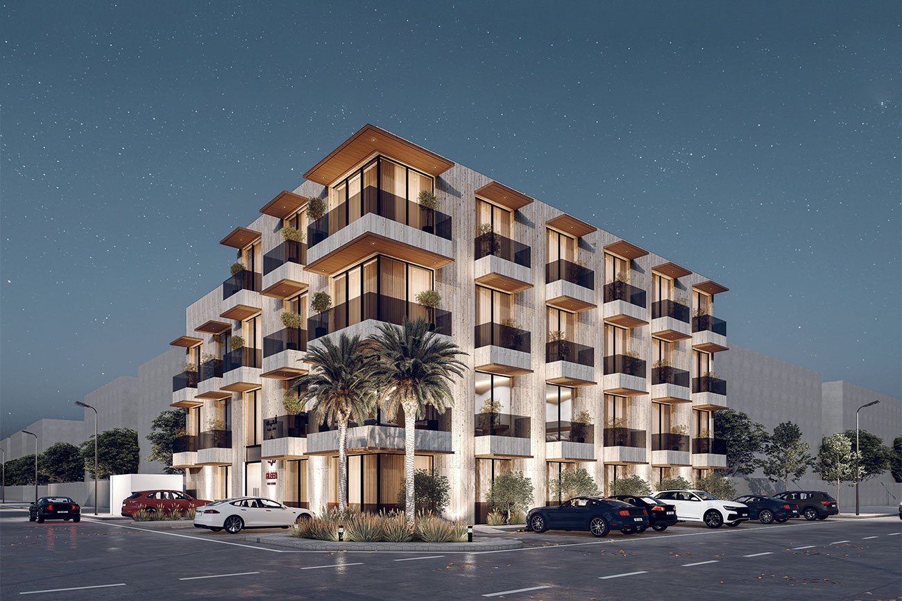 The exterior design of Aleen 102 is characterized by its distinctive architectural style, featuring protruding balconies that add depth and dimension to the façade. The entire building is clad in travertine stone, a durable and elegant natural material, enhancing the project’s modern aesthetic while ensuring suitability for the local climate.
